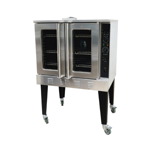 Horno de convección a gas con controles eléctricos. Está fabricado en acero inoxidable 430 con puertas batientes de alto impacto con vidrio para fácil visibilidad. Luz halógena interior. Motor de 1/2HP con dos velocidades (1140 RPM/1725 RPM). Control de temperatura graduable de 0-295°C o 0-563°F. Temporizador de 0-60 minutos.